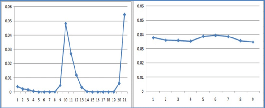 Baker et al. explain that, “entering a common multiple” (left, Figure 5) results in a “spiky” graph, indicating eureka learning, while “identifying the converted value in the problem statement of a scaling problem” (right, Figure 5) results in a relatively smooth graph, indicating more gradual learning (p. 14).